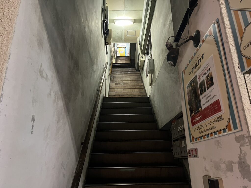 薄暗い急な階段を階段を駆け上がるスタイルだ。