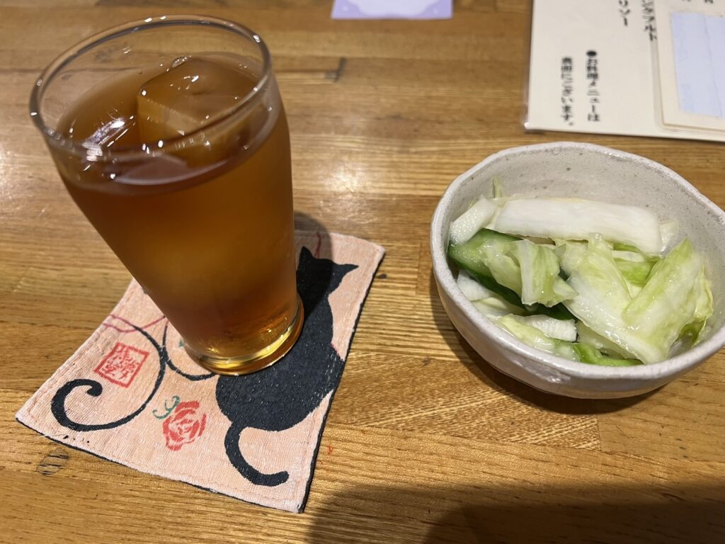 ウーロン茶と漬物。ちなみに漬物は優しい味わいで個人的好みに突き刺さった。最高。